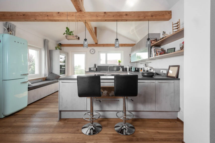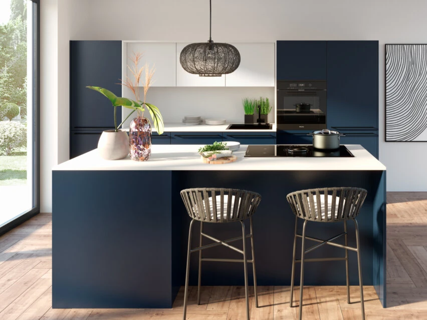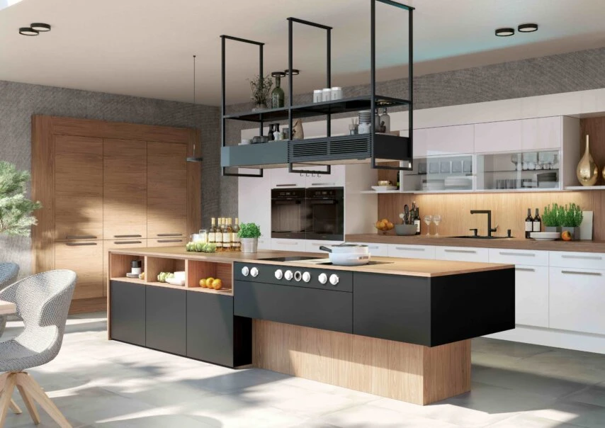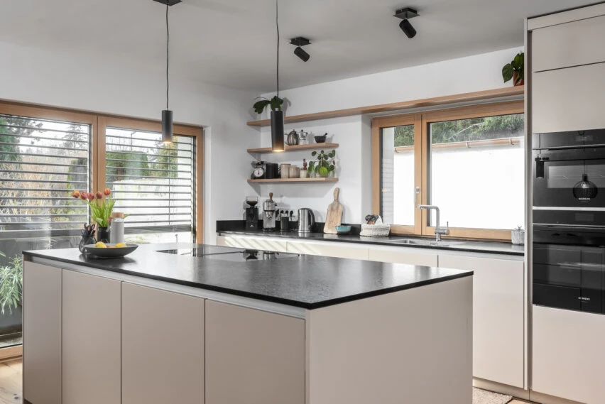 In offenen Wohnräumen überzeugt die Verbindung aus Küchenzeile und Insellösung – die Insel wird zum Mittelpunkt, an dem gekocht, serviert und gemeinsam Zeit verbracht wird.