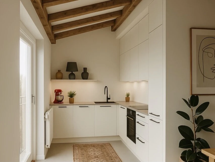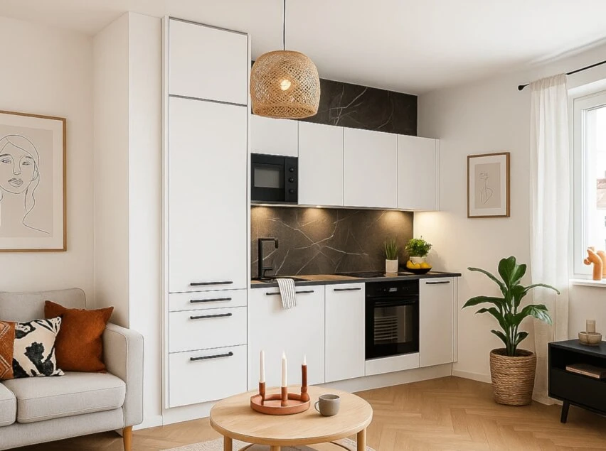 Eine kompakte Küchenzeile vereint auf kleinem Raum alle wichtigen Funktionen und eignet sich perfekt für begrenzte Platzverhältnisse.